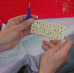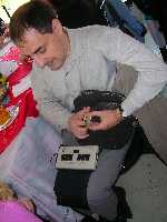 Adolfo nos mostró un pequeño anotador y una caja con 7 teclas que funciona como una especie de computadora, donde se almacenan datos ingresados mediante golpeteos en las teclas, y que de acuerdo a la cantidad de los mismos, se interpretan como cada letra del alfabeto. Los datos almacenados, luego son transmitidos en forma sonora, mediante un parlante que tiene incorporado o en forma de datos, a través de un cable conectado a una computadora.