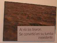 Algo escalofriante es una mesa blanca, cruzada por alambres conectados a electricidad a través de un transformador. La llamada "parrilla" donde se torturaba. La muestra es un terrible recuerdo de los desaparecidos, como tema central, que se hace presente en las distintas obras, donde no falta el "Falcon" y el río, que fue una de las sepulturas elegidas en la época de la represión.