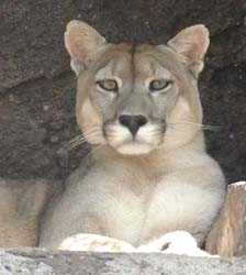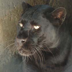 La pantera negra, desperezándose, observándonos de revés, con sus ojos amarillos que contrastan con su pelaje negro intenso, brilloso y un bellísimo ejemplar de puma, con su mirada alerta y su color suave y aterciopelado.