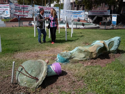 Junto a ellos había dos turistas españolas que también llegaron al lugar, interesadas por saber cuál era su reclamo. Informaron acerca del tema y además contaron con dolor sobre las 17 cruces blancas, en un cantero de la plaza, que simboliza a los 17 compañeros muertos en la zona del litoral marítimo patagónico, en escaramusas con comandos ingleses, que fueron reconocidos como héroes de guerra muertos en combate, al caer un helicóptero derribado y "nosotros, los que quedamos vivos no hemos sido reconocidos, habiendo estado en el mismo lugar, junto a ellos".