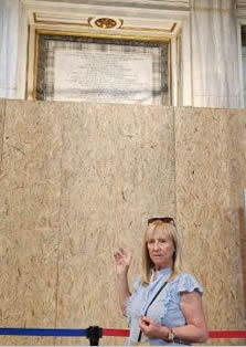 Foto izquierda: Susana Espósito en Plaza San Pedro, Vaticano, durante el velatorio de Francisco. Foto derecha: Susana Espósito indica en qué lugar sería sepultado el Papa Francisco en la capilla lateral de la Basílica Santa María Maggiore en Roma.